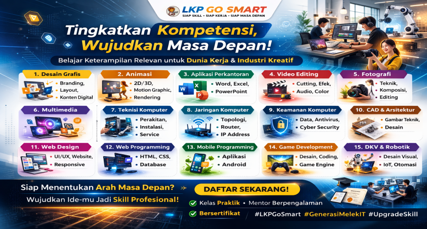 LKP Go Smart hadir untuk membantu generasi muda dan masyarakat umum agar menjadi pribadi yang siap menghadapi era teknologi.